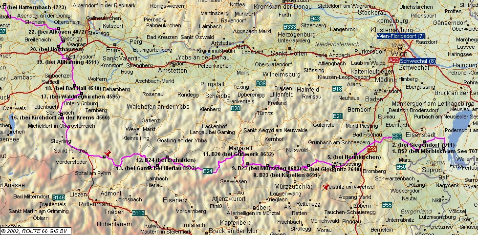 ![]() Bei immer noch herrlichem Wetter ging es am Samstag, den 22.06.2002 durch die Alpen über Mürzsteg, Gußwerk, Preiner Gscheid und den Hengstpass wieder ins Flachland, zur letzten Übernachtung nach Natternbach (ca. 360 km) |